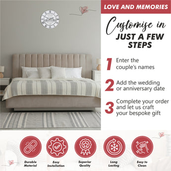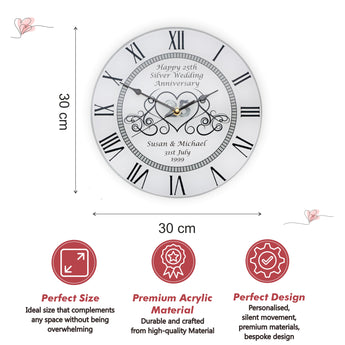 Celebrate the special silver wedding anniversary with a beautiful custom-made clock. This unique and personalised wall-mountable clock is crafted from premium Perspex acrylic and features roman numerals. With its 30cm circle, this timeless gift will make a lasting impression. Supplied with wall hanging kit and 1x AA battery, it's the perfect way to commemorate the special day!