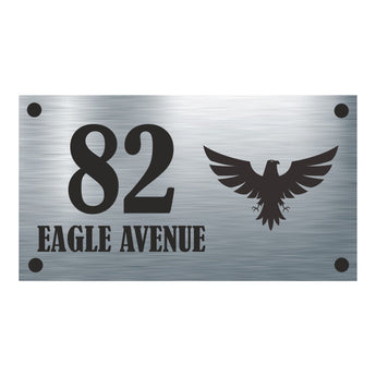 Our exclusive Eagle Silhouette aluminium house sign is sure to make a statement. Produced from brushed silver aluminium with pre-drilled screw holes, it is 11cm in height and 20cm in width with all fittings and black screw cap covers included. Personalise your house sign with the house name or number and street name, perfect for outdoor and indoor use. Show off your sophistication with this luxurious sign.
