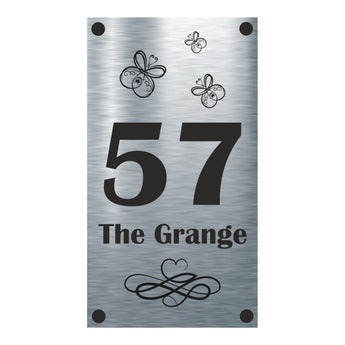 The Grange Vertical Aluminium House Sign is a stylish way to display your address with a 20cm x 11cm brushed silver aluminium design. Easily installed with pre-drilled screw holes and included fixings, this sign is suitable for both indoor & outdoor use. Personalise your house sign by entering your address in the customised boxes provided.