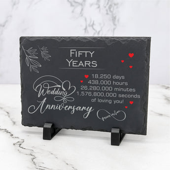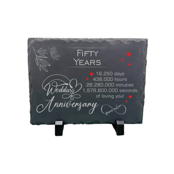 Mark an extraordinary milestone of 50 years together with this elegant Fifty Year Wedding Anniversary Slate Plaque. printed with love and precision, this piece honours a relationship that has stood the test of time—18,250 days, 438,000 hours, 26,280,000 minutes, and 1,576,800,000 seconds of shared memories, laughter, and love.