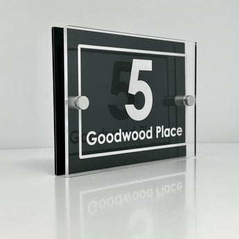 The Goodwood Modern House Sign with Perspex Acrylic Front, Anthracite Grey Rear Panel and Satin Silver Stand Off Fixings ( Size - 20cm x 14cm )