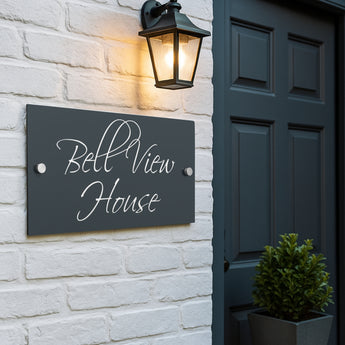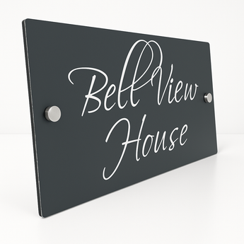 The Bell View Modern House Sign with a Anthracite Grey Panel and Satin Silver Stand Off Fixings ( Size - 35cm x 18cm )