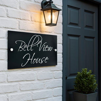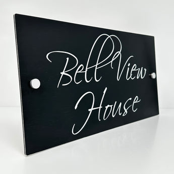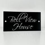 The Bell View Modern House Sign with a Brushed Black Panel and Satin Silver Stand Off Fixings ( Size - 35cm x 18cm )
