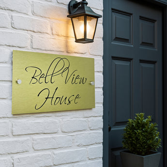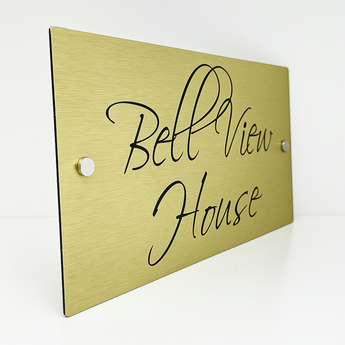 The Bell View Modern House Sign with a Brushed Gold Panel and Satin Silver Stand Off Fixings ( Size - 35cm x 18cm )