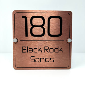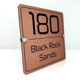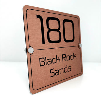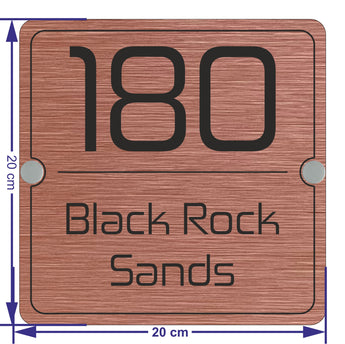 The Black Rock Sands Modern House Sign with a Brushed Copper Panel and Satin Silver Stand Off Fixings ( Size - 20cm x 20cm )
