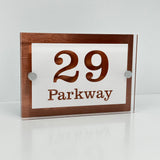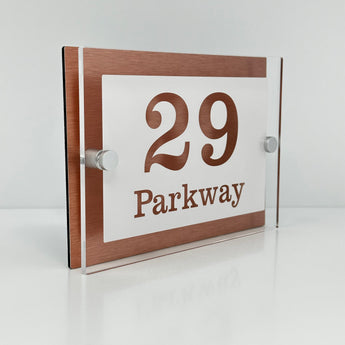 The Parkway Modern House Sign with Perspex Acrylic Front, Copper Rear Panel and Satin Silver Stand Off Fixings ( Size - 20cm x 14cm - WHITE BACKGROUND CLEAR TEXT )