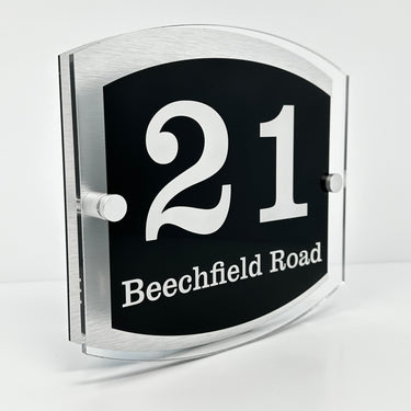 The Beechfield Modern House Sign with Perspex Acrylic Front, Brass Rear Panel and Satin Silver Stand Off Fixings ( Size - 20cm x 18cm - WHITE BACKGROUND BLACK TEXT )