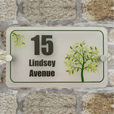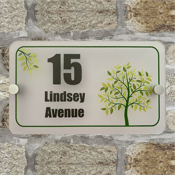 Give your home a modern, elegant touch with this one-of-a-kind frosted effect house sign featuring a breath taking colourful tree design. This premium sign is crafted from high quality materials, complete with aluminium standoffs and a durable Perspex acrylic panel. The perfect size of 20cm by 12cm accompanied with a fitting kit makes it easy and seamless to install.