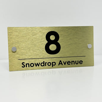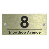 The Snowdrop Modern House Sign with a Brushed Gold Panel and Satin Silver Stand Off Fixings ( Size - 25cm x 12cm )