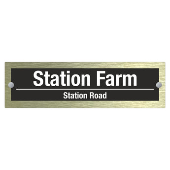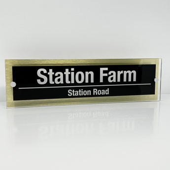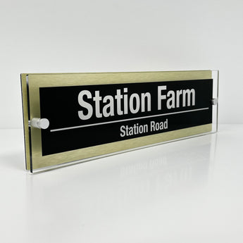 The Station Farm Modern House Sign with Perspex Acrylic Front, Gold Rear Panel and Satin Silver Stand Off Fixings ( Size - 42cm x 12cm )