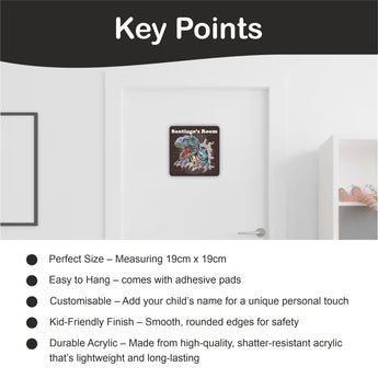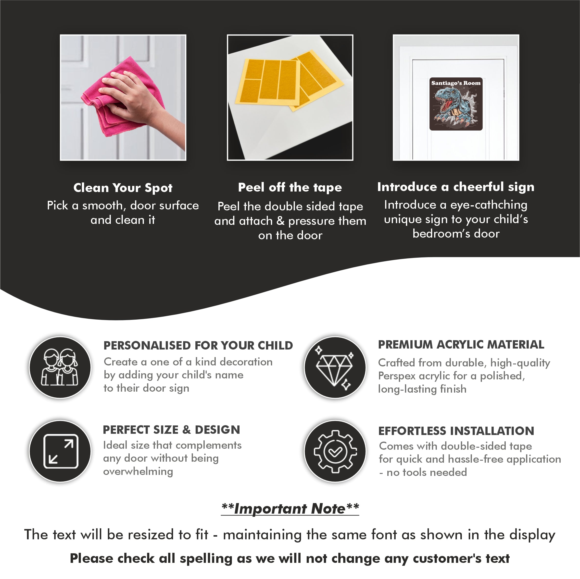 Welcome to the age of prehistoric chic! Unearth a unique, eye-catching design with this Personalised T Rex Dinosaur Coming Out Of Wall Kids Bedroom Door Sign. Made from premium Perspex acrylic, it's perfect for making sure your kids sleep soundly, knowing their bedroom is safe. Plus, it's made just for them, printed with their name. Stick it up and make a roar-some statement!