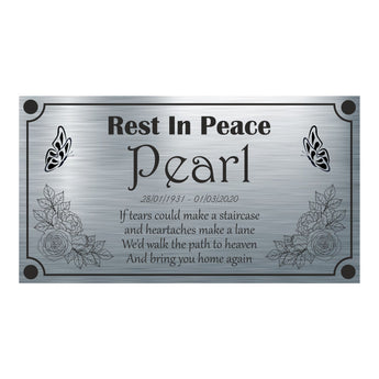 Remember a loved one with our beautiful brushed silver Memorial Plaque - Flower & Butterfly Design. The 11cm x 20cm plaque features an elegant flower and butterfly design and is perfect for both indoor and outdoor use. Pre-drilled screw holes and all the fixings come included so you can commemorate their life easily and simply.