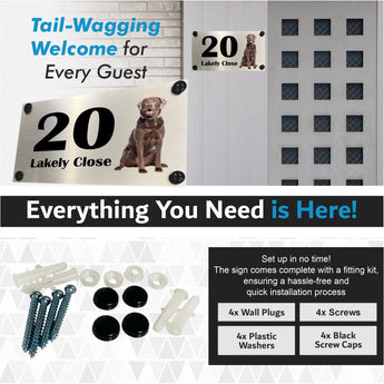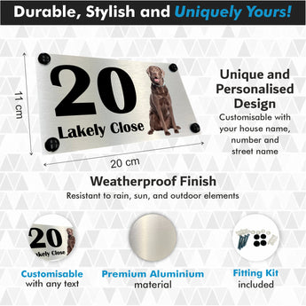 Welcome guests with style with this stunning Chocolate Labrador Aluminium House Sign. A perfect addition to any home, this house sign features a unique design and a brushed silver aluminium finish that's durable and weatherproof. Easily customise it with your house name or number and street name. With pre-drilled screw holes and included fixings, installation is a breeze-- adding elegance and character to your entrance in no time.