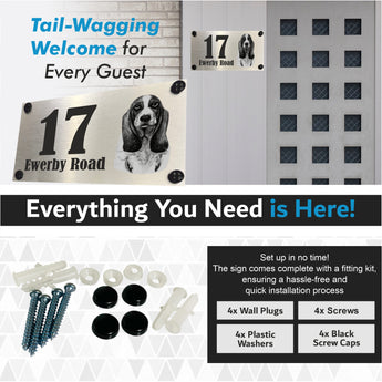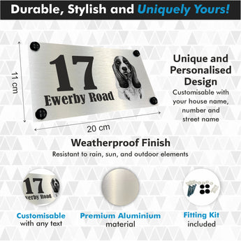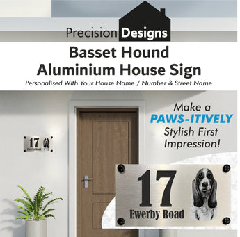 Introducing our Dog Collection - Basset Hound aluminium house sign, the perfect way to give your house a unique and personalised touch! Our 11cm x 20cm brushed silver sign is made of tough aluminium, so it can stand up to both indoor and outdoor conditions. And it comes complete with pre drilled holes and screws, so you can hang it with ease. Simply enter your house name or number and street name - and you're ready to go! Add a charm to your home now!