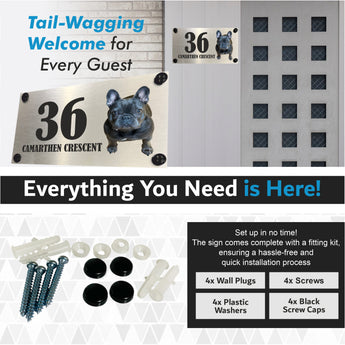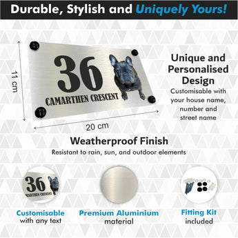 This Dog Collection House Sign is ideal for personalised outdoor and indoor décor. Crafted from brushed silver aluminium and pre-drilled for easy installation, it boasts a stylish French Bulldog design measuring 11cm x 20cm. All the necessary fixings and black screw covers are included.