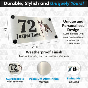 Beautify your house with the Dog Collection - English Bull Terrier Brindle Aluminium House Sign! Made from high quality brushed silver aluminium, it features a height of 11cm and width of 20cm to fit perfectly on your door. Pre-drilled holes with black screw cap covers provide easy installation and make it suitable for both indoor and outdoor use. Enter your house name and street name to customise the sign - perfect for adding a personal and unique touch!