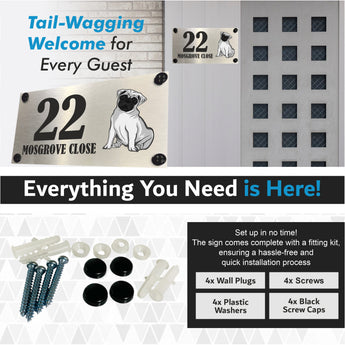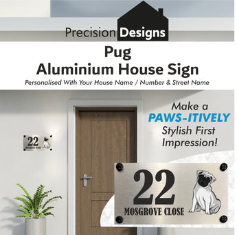 Add a unique touch to your home with our Dog Collection - Pug Aluminium House Sign! Crafted from brushed silver aluminium, this stunning house sign comes pre-drilled with holes, plus all the fixings and black screw cap covers for easy installation! Personalise it with your house's name or number and street name, and enjoy its beauty indoors or outdoors. Make a statement and add a touch of class to your home - get yours now!