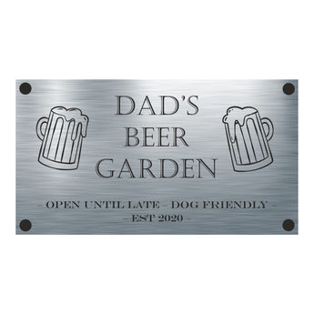 This FUN - Dad's Beer Garden Aluminium Plaque will be a treasured gift your Dad will proudly display. Crafted from a brushed silver aluminium with pre-drilled holes and supplied with all fixings, it stands 11cm tall and 20cm wide making it a unique keepsake that can be hung both indoors and outdoors! Let dad proudly show off his beer garden!