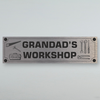 Bring a special touch to your home with this unique FUN Grandad's Workshop Aluminium Plaque. It's made of brushed silver aluminium and comes with pre-drilled screw holes, as well as all the fixings and black screw cap covers. Plus, it's suitable for both indoor and outdoor use, measuring 7cm in height and 25cm in width. Let Grandad's Workshop be part of the memories you make!