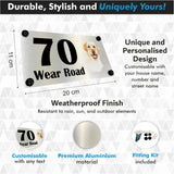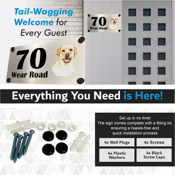 Welcome guests to your home with our personalised Dog Collection - Golden Labrador Aluminium House Sign. Featuring an eye-catching design of a golden Labrador, this stylish yet durable sign measures 11 cm in height and 20 cm in width, made from brushed silver aluminium. With pre-drilled holes and all necessary fixings, it's easy to install and suitable for both indoor and outdoor use. Make it uniquely yours by adding your house name or number and street name in the boxes provided.