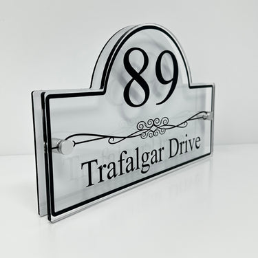 The Trafalgar Modern House Sign with Perspex Acrylic Front, White Rear Panel and Satin Silver Stand Off Fixings ( Size - 30cm x 18cm )