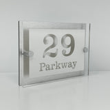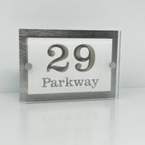 The Parkway Modern House Sign with Perspex Acrylic Front, Silver Rear Panel and Satin Silver Stand Off Fixings ( Size - 20cm x 14cm - WHITE BACKGROUND CLEAR TEXT )