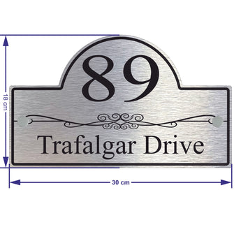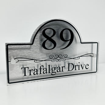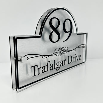 The Trafalgar Modern House Sign with Perspex Acrylic Front, Silver Rear Panel and Satin Silver Stand Off Fixings ( Size - 30cm x 18cm )