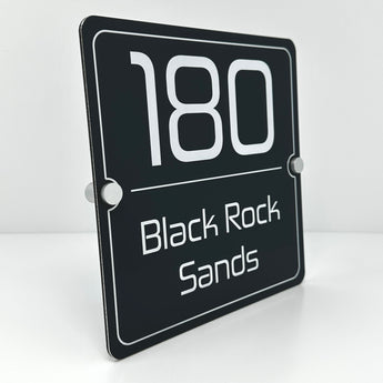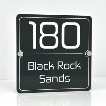 The Black Rock Sands Modern House Sign with a Anthracite Grey Panel and Satin Silver Stand Off Fixings ( Size - 20cm x 20cm )