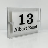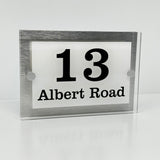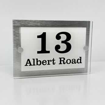 The Albert Modern House Sign with Perspex Acrylic Front, Silver Rear Panel and Satin Silver Stand Off Fixings ( Size - 20cm x 14cm - WHITE BACKGROUND BLACK TEXT )