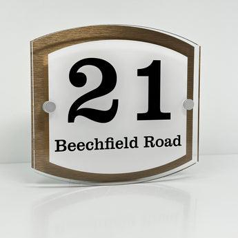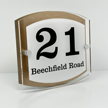 The Beechfield Modern House Sign with Perspex Acrylic Front, Brass Rear Panel and Satin Silver Stand Off Fixings ( Size - 20cm x 18cm - WHITE BACKGROUND BLACK TEXT )