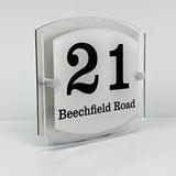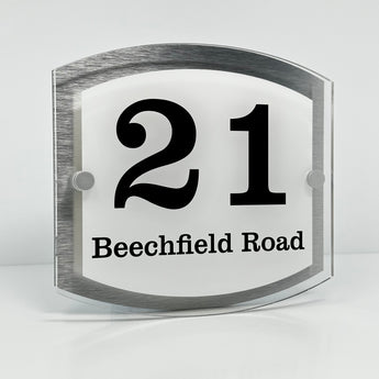 The Beechfield Modern House Sign with Perspex Acrylic Front, Silver Rear Panel and Satin Silver Stand Off Fixings ( Size - 20cm x 18cm - WHITE BACKGROUND BLACK TEXT )