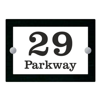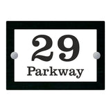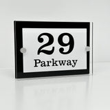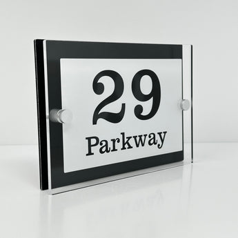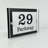 The Parkway Modern House Sign with Perspex Acrylic Front, Black Rear Panel and Satin Silver Stand Off Fixings ( Size - 20cm x 14cm - WHITE BACKGROUND CLEAR TEXT )