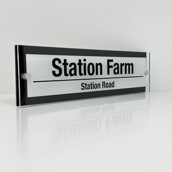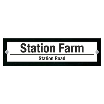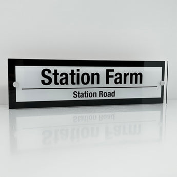 The Station Farm Modern House Sign with Perspex Acrylic Front, Black Rear Panel and Satin Silver Stand Off Fixings ( Size - 42cm x 12cm - WHITE BACKGROUND BLACK TEXT )