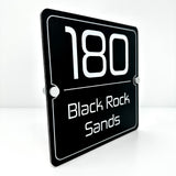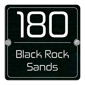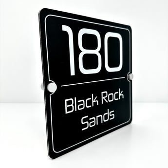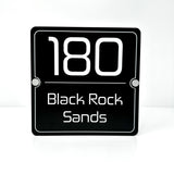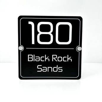 The Black Rock Sands Modern House Sign with a Brushed Black Panel and Satin Silver Stand Off Fixings ( Size - 20cm x 20cm )