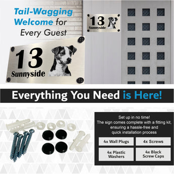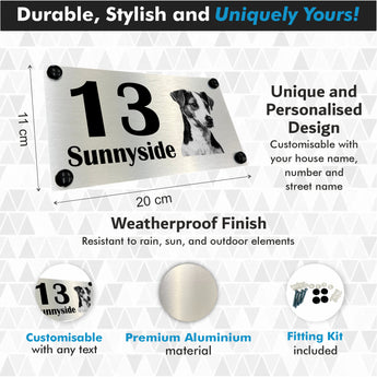 Say hello to your pup with a personalised Dog Collection sign! This brushed silver aluminium sign is 11cm high and 20cm wide, made to last both indoors and outdoors. Add your house name or number and street name -- it's easy, just fill in the boxes provided. Complemented with pre-drilled screw holes and all fixings, plus black screw cover caps for a neat and tidy finish. Add a special touch to your home with the Jack Russell Aluminium House Sign!
