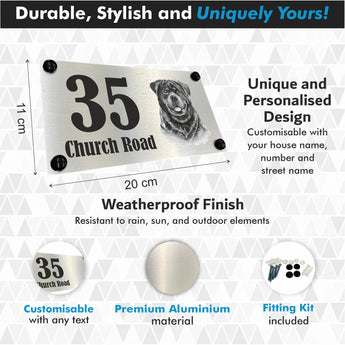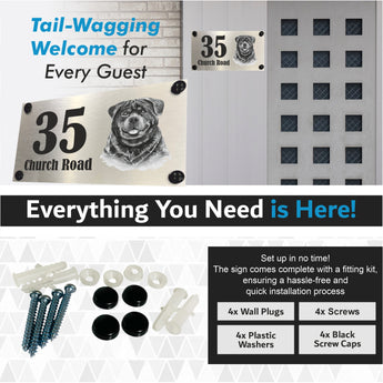 Show off your love of Rottweilers with this stylish aluminium house sign. Brushed silver with pre-drilled holes, it comes with all necessary fixings and black screw cap covers. Proudly display your house name/number and street name with this durable sign - perfect for both indoor and outdoor use. Make a statement with this beautiful Dog Collection piece!