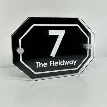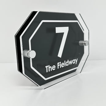 The Fieldway Modern House Sign with Perspex Acrylic Front, Black Rear Panel and Satin Silver Stand Off Fixings ( Size - 20cm x 14cm )