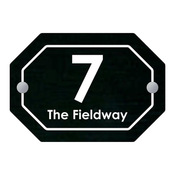 Experience luxury and sophistication with the Fieldway Modern House Sign. Featuring a premium Perspex acrylic panel, a black aluminium composite background, and satin silver stand off fixings, this majestic piece of craftsmanship is guaranteed to turn heads. Divulge in an aesthetic of exclusivity, fitting and styling your living space with this one-of-a-kind 20cm x 14cm sign.