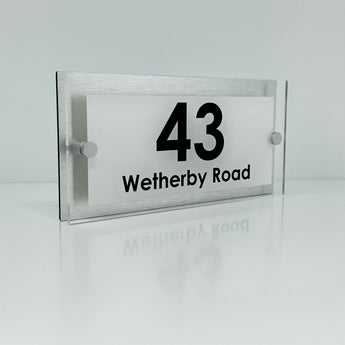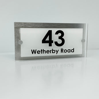The Wetherby Modern House Sign with Perspex Acrylic Front, Silver Rear Panel and Satin Silver Stand Off Fixings ( Size - 25cm x 12cm - WHITE BACKGROUND BLACK TEXT )