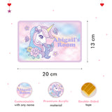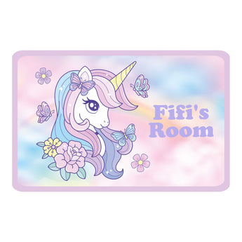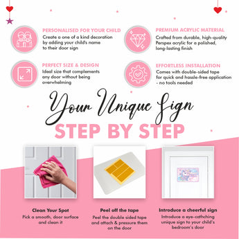 Welcome your child to the magical world of unicorns with this whimsical personalised bedroom door sign! Crafted with premium Perspex acrylic and printed with your child's name, they'll feel extra special every time they enter their room. Our signs come complete with double sided tape for an easy hang.
