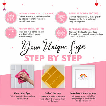 Welcome to your own magical kingdom! Our Personalised Unicorn in a Rainbow with Hearts Kids Bedroom Door Sign is a perfect way to introduce your wee one to their own fantasyland. Personalised with any name plus also with double sided tape for easy fixing, this customised 18cm x 11cm sign brings a touch of sparkle and fun to your little one's space. Yay!