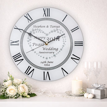 Celebrate a memorable 30th wedding anniversary with this beautifully bespoke, custom-made wall clock. Featuring a classic 30cm circular design with Roman numerals, this elegant timepiece is crafted in-house from high-quality premium Perspex acrylic, making it a timeless keepsake for a special milestone.
