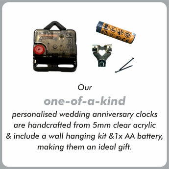 Show your loved one the time of your life with our Love / Wedding Anniversary Clock. This beautifully crafted, personalized clock comes made with premium Perspex acrylic, making a unique and bespoke gift for your special occasion. Plus, it comes with wall hanging kit and a battery, making it extra easy to mount, so you don't miss a second of your happy memories.