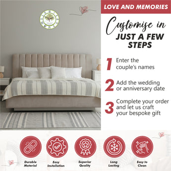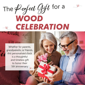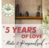 Celebrate your 5th wedding anniversary with a unique and personalised clock. This custom-made wall mountable clock is made from premium Perspex acrylic and is the perfect BESPOKE GIFT for your special day. The clock features a 30cm circle with Roman numerals and includes a wall hanging kit and 1x AA battery.
