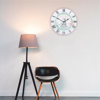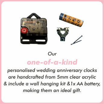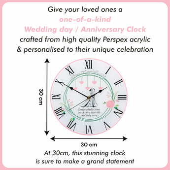 Celebrate your special day forever with this beautiful wall mountable clock. Made with high quality premium Perspex acrylic, this 30cm Clock with Roman Numerals is personalised and custom made just for you. Includes wall hanging kit & 1x AA Battery - all you need to do is hang and enjoy.