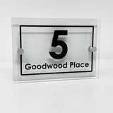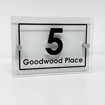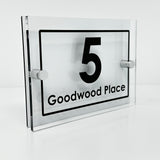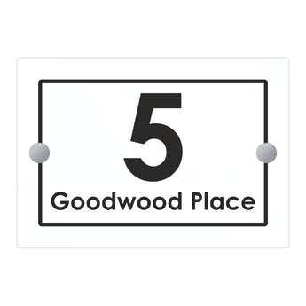 The Goodwood Modern House Sign with Perspex Acrylic Front, White Rear Panel and Satin Silver Stand Off Fixings ( Size - 20cm x 14cm )
