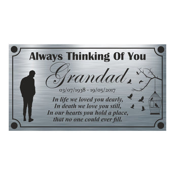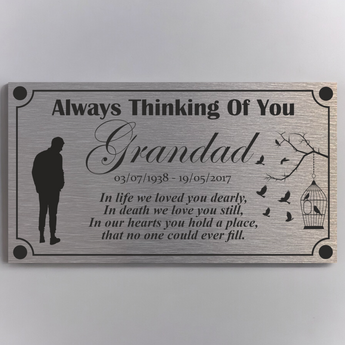 Honour the memory of a special person with our Memorial Plaque - Grandad Design. Crafted from brushed silver aluminium, this 11cm x 20cm plaque can be personalised with any name to make a special memento. Perfect for indoor or outdoor use, it comes with pre-drilled holes and all needed fixings, including black screw cap covers.